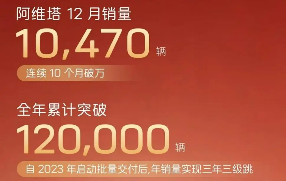 另據阿維塔最新發布的數據,其2025年12月托福新車10470輛,鳩集10個月單月銷量破萬;2025年累計托福新車沖破12萬輛,自2023年動手批量托福后兌現了從2萬到6萬,再到12萬輛的年銷量“三級跳”。