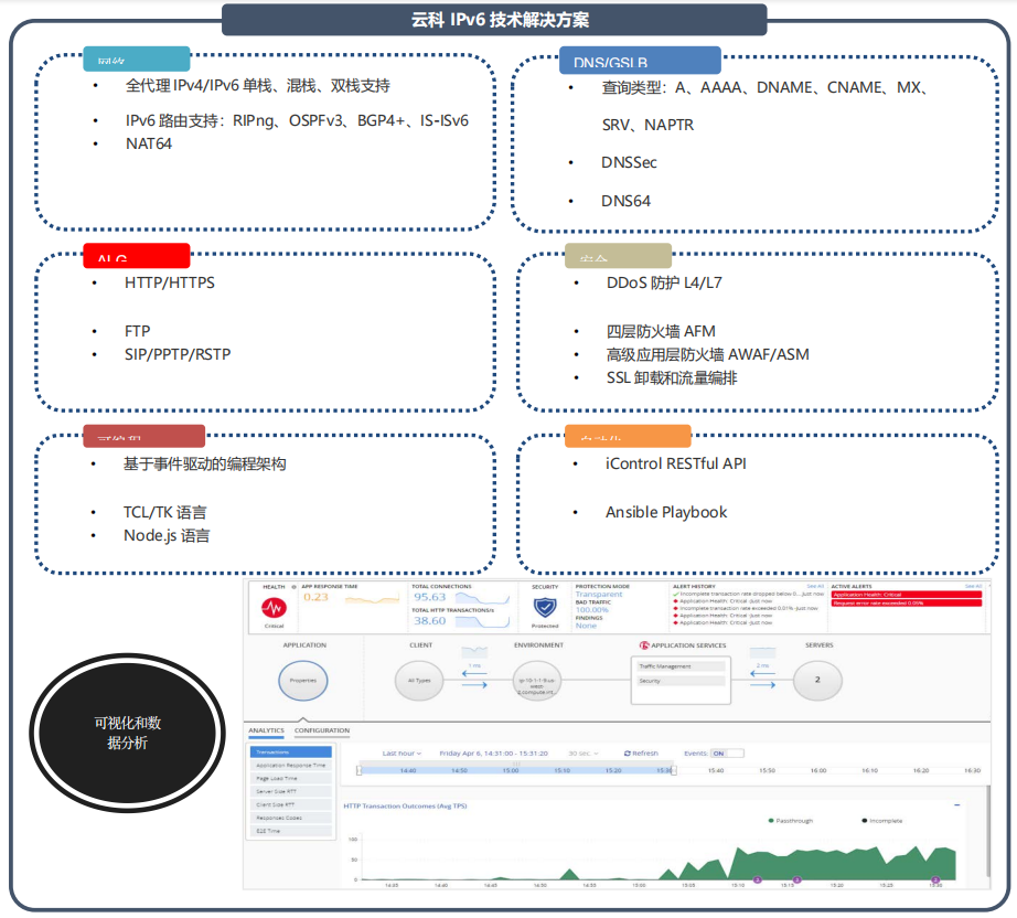 全球范圍內支持無線和互聯網的設備日益增多,導致 IPv4 地址快速耗盡。與此同時,IPv6 的普及速度比預計的要慢。服務提供商需要一款解決方案,幫助他們應對 IPv4 地址耗盡的問題,并基于無縫遷移到 IPv6 以實現網絡優化。通過提供大量的IP地址轉換、快速的NAT 轉換率、高吞吐率能力和高速的日志審計功能實現運營商級平臺的可擴展性。